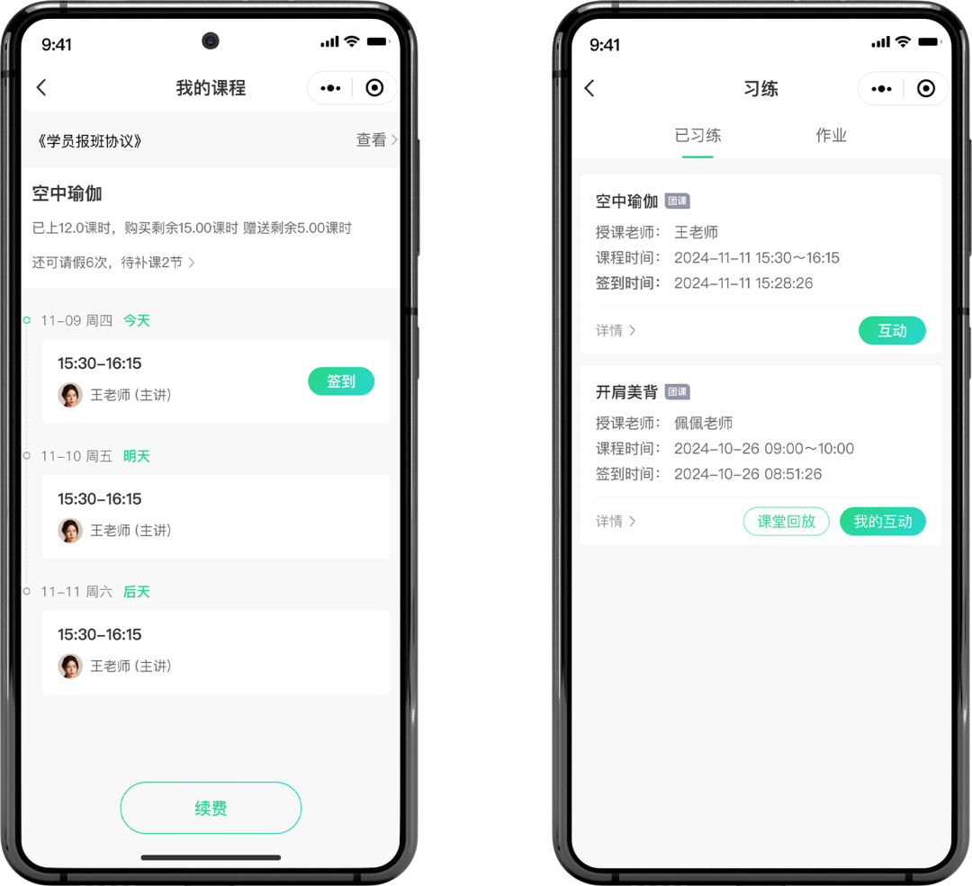 多场景签到,数据实时录入:学员到店后,可通过“人脸识别、扫码签到、老师点名代签”三种方式签到,签到成功后,系统会自动关联对应课程,实时扣减课时,无需老师手动登记;