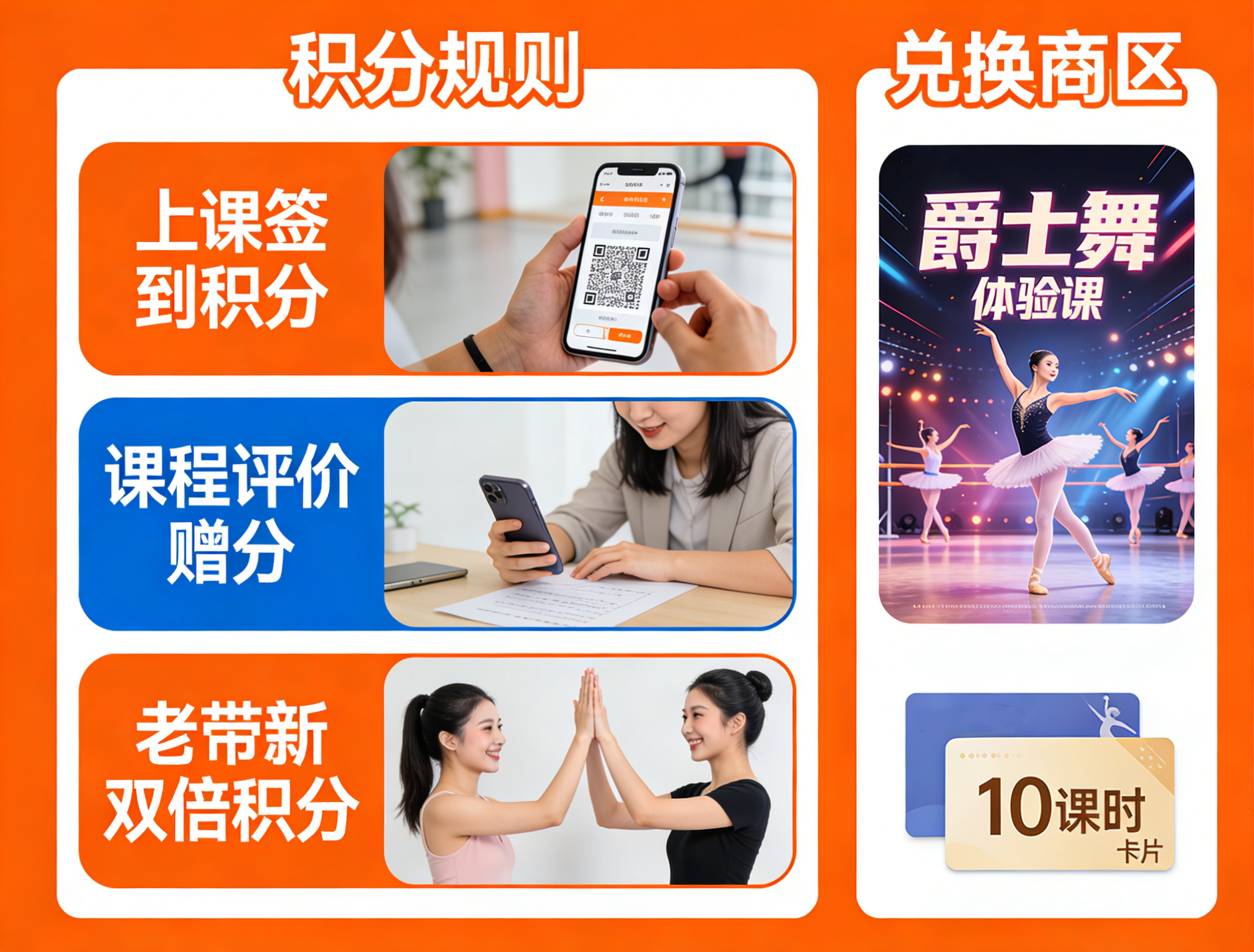 对于舞蹈室而言,积分兑换功能可深度绑定学员习练场景。场馆可设置 “上课签到积 10 分”“课程评价额外赠 5 分”“老学员带新获双倍积分” 等规则,搭配爵士舞体验课、芭蕾课时包、舞蹈服装等兑换商品,既激发学员上课积极性,又借助 “积分清零提醒” 促使学员定期兑换,解决舞蹈课程续课率低的痛点。结合当下舞蹈场馆依赖社交营销的趋势,会员兑换课程后分享至各个平台,还能为场馆带来新流量,助力在竞争激烈的市场中突围。